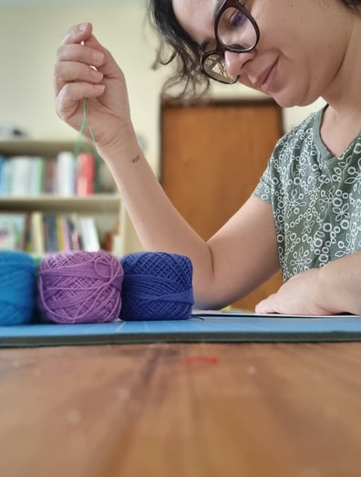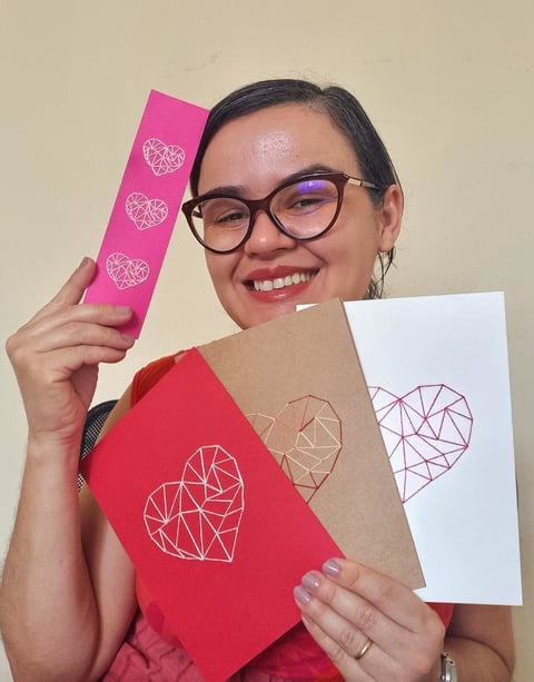 Eu sou a Mônica Franco, tenho 43 anos e sou professora de formação. Atuo na rede pública municipal de São Paulo, e sou formada em Arte e Pedagogia. Eu sempre fui apaixonada por todas as formas de Arte mas o artesanato só chegou na minha vida comigo já adulta. Eu faço crochê, cheguei até a ter um Instagram voltado a essa técnica e em 2021 eu decidi que queria aprender a bordar. Comprei bastidor, tecido, linha e agulha e antes mesmo de começar no suporte tradiconal eu vi um caderno com capa bordada no papel e fiquei apaixonada! Achei super diferente. Embarquei na técnica e nunca mais larguei. Desenvolvi a marca Papéis Que Bordam e tornei especialista na técnica do bordado no papel. Bordar no papel me fez tão bem que eu resolvi ensinar para transformar a vida de mais pessoas e fazer com que elas descubram que gente comum também pode fazer Arte!